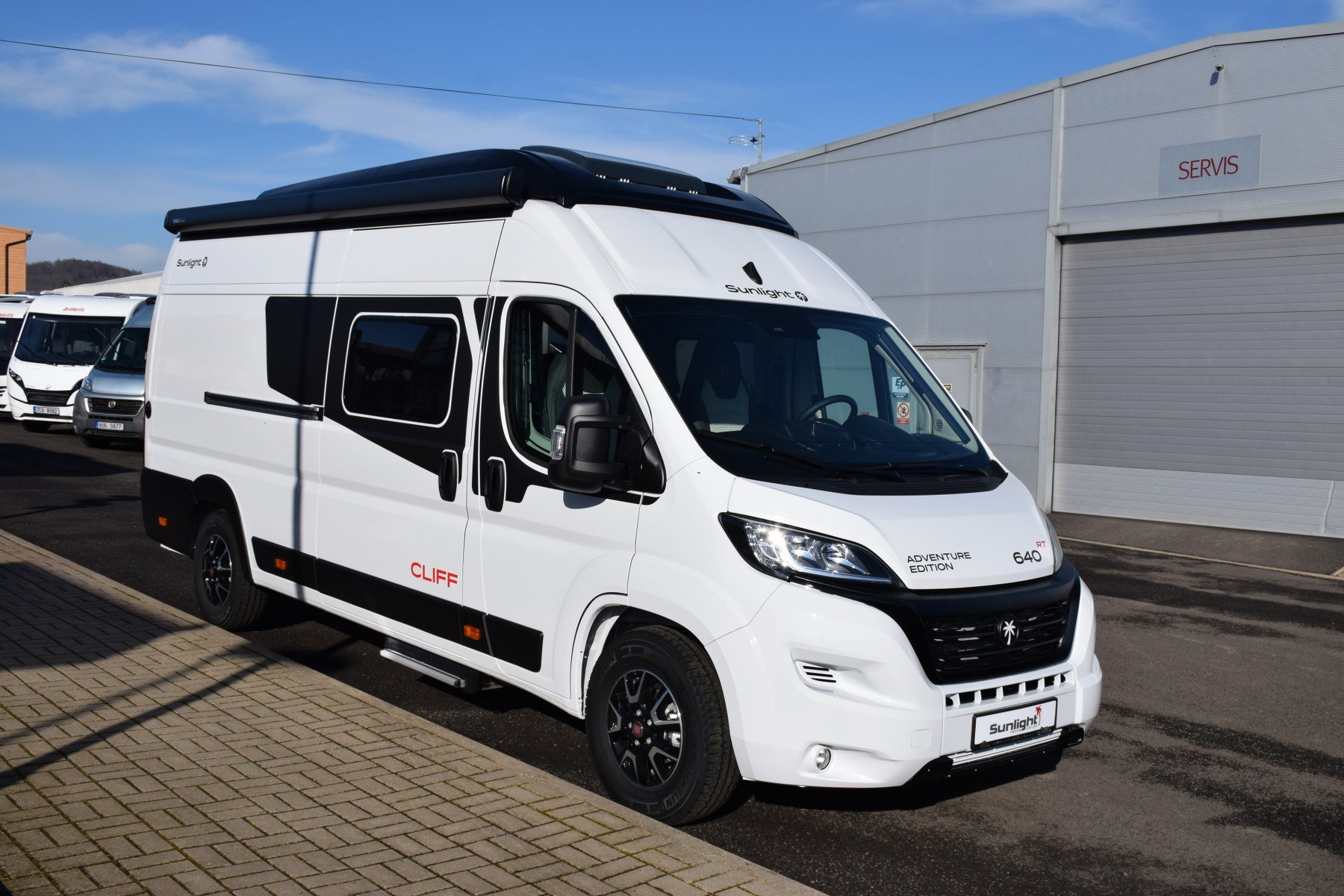 Sunlight Cliff 640 RT Adventure je obytná dodávka ze zadními podélnými lůžky, zvedací střechou a ediční "ADVENTURE" výbavou (markýza, ALU disky, LED denní svícení, kožený volant, ....).